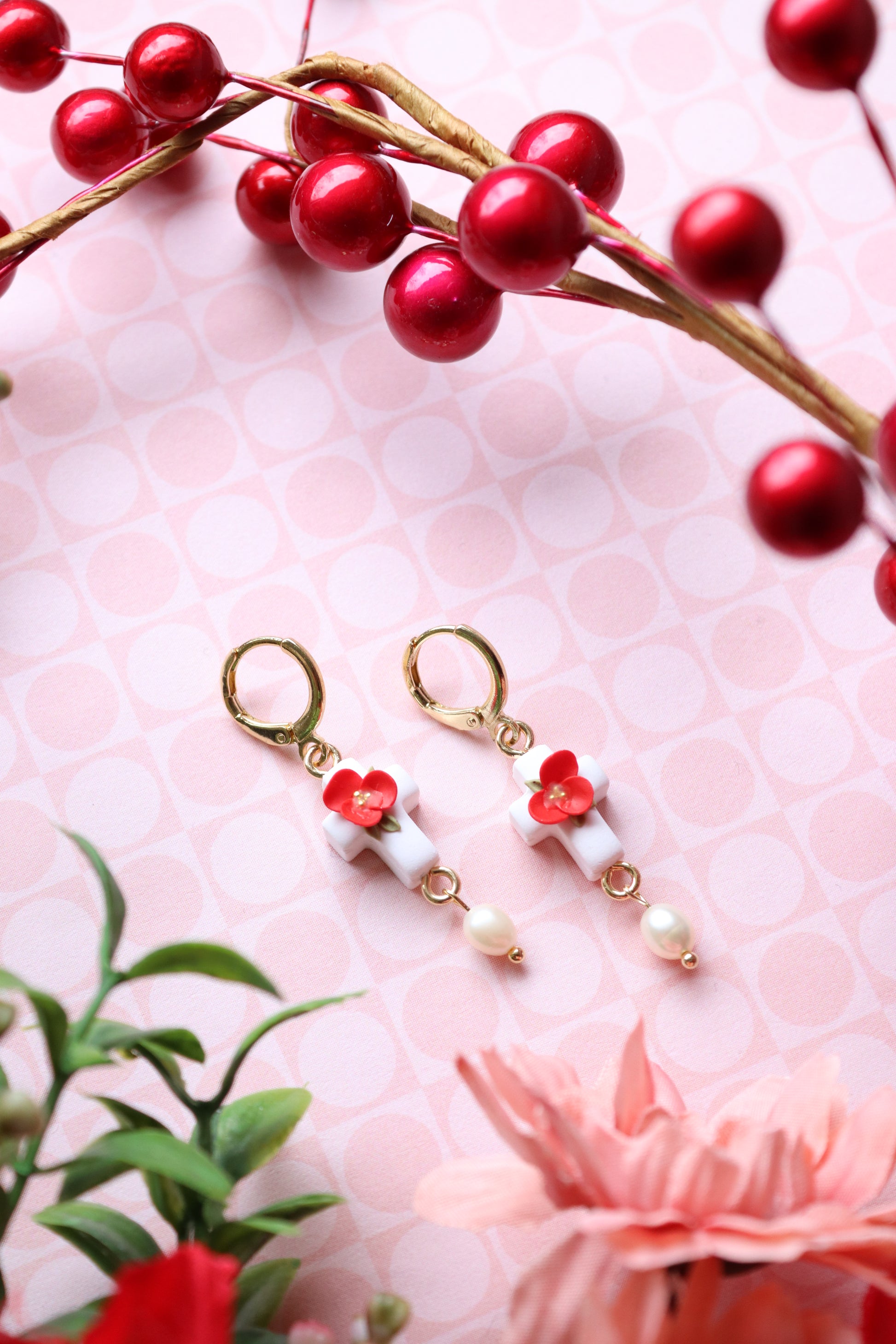 Dainty floral cross earrings with 18k gold-plated leverback huggies and freshwater pearls.