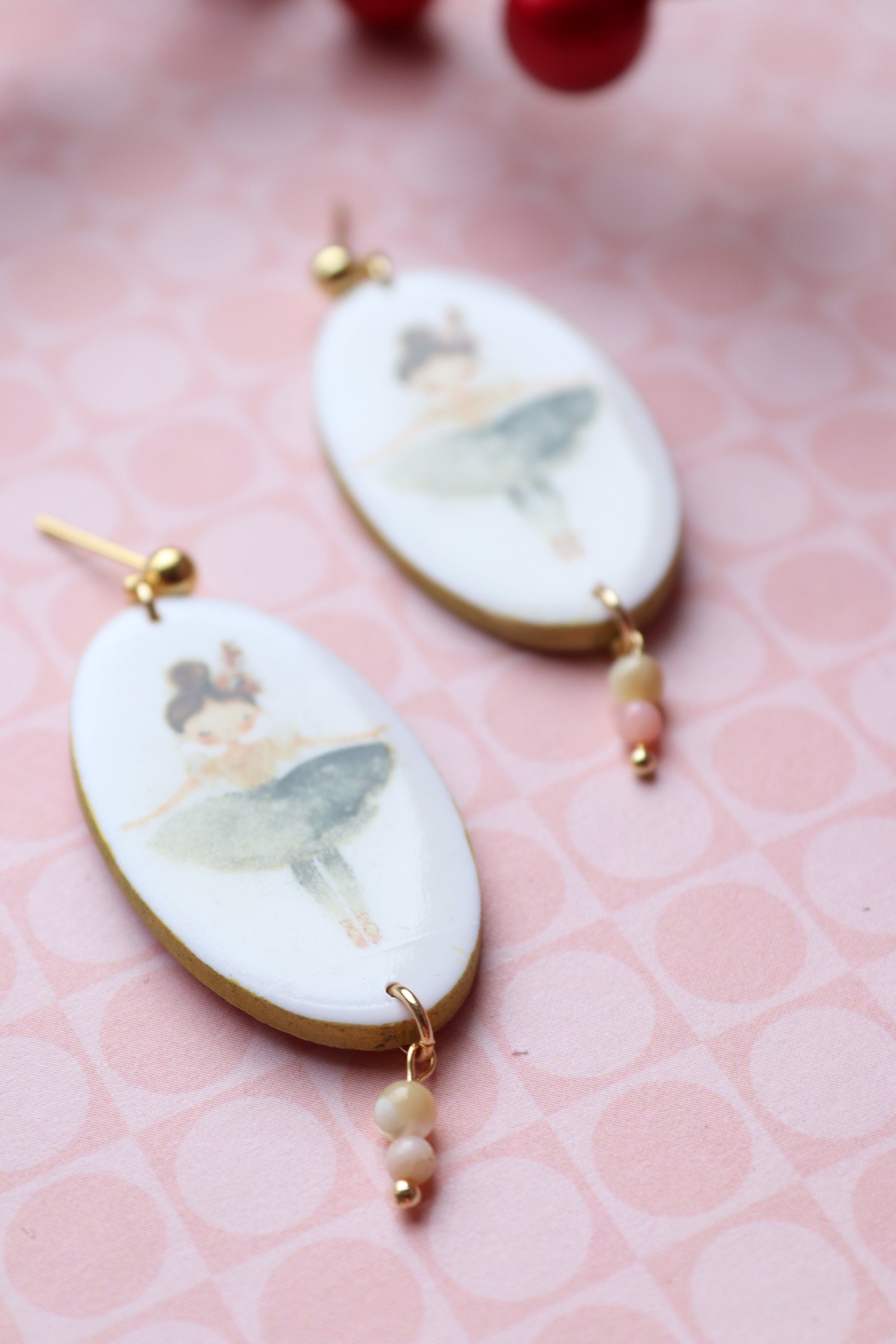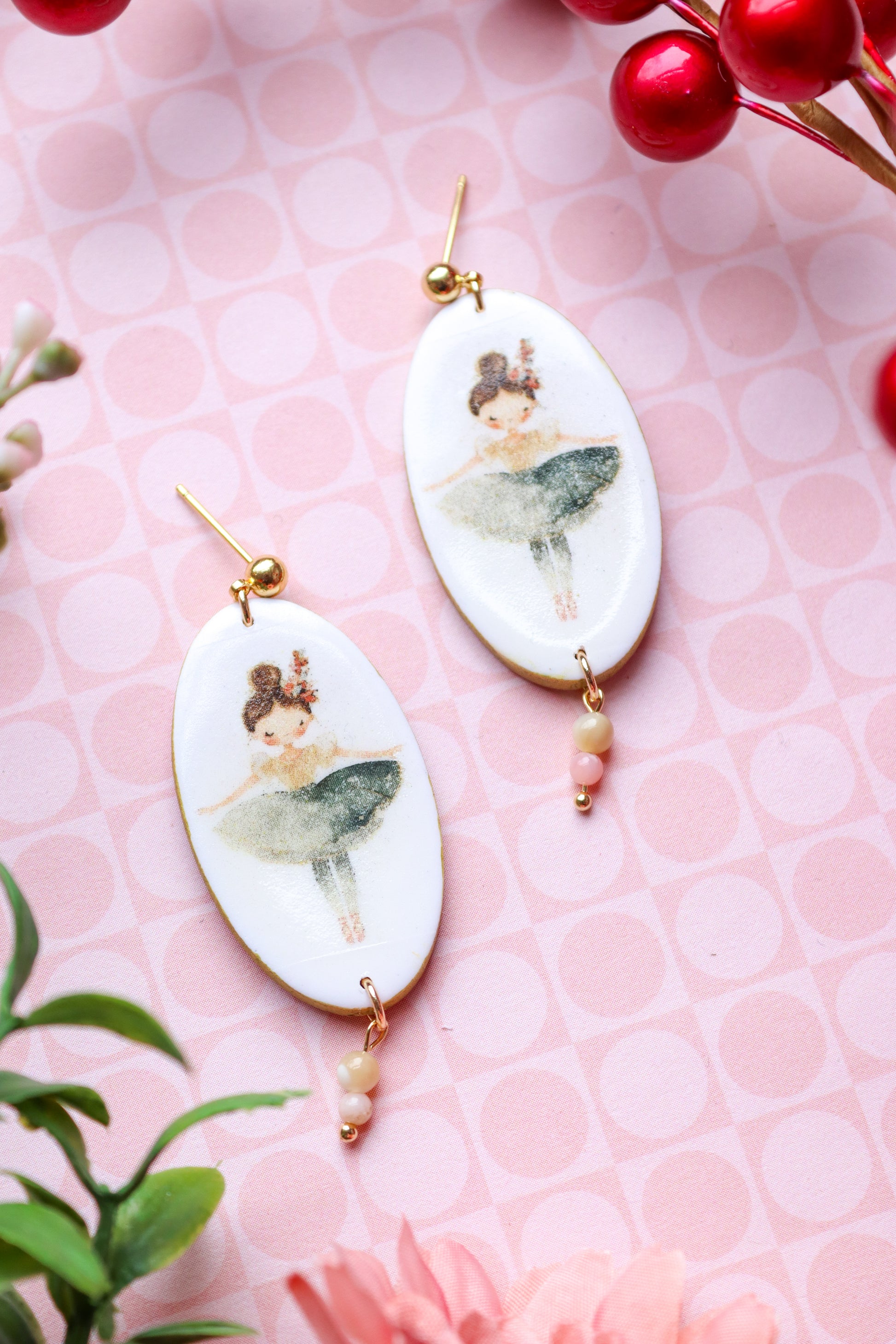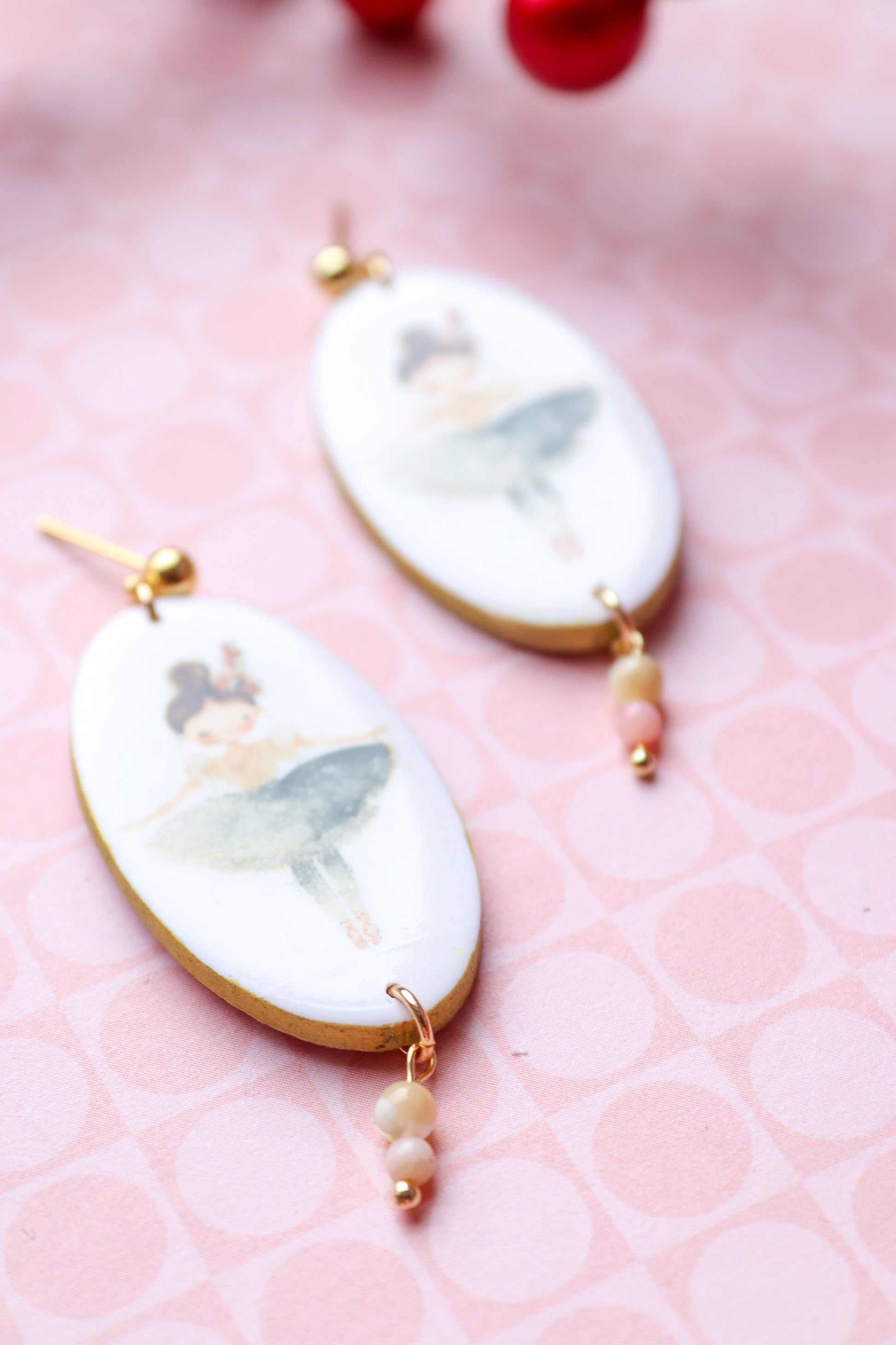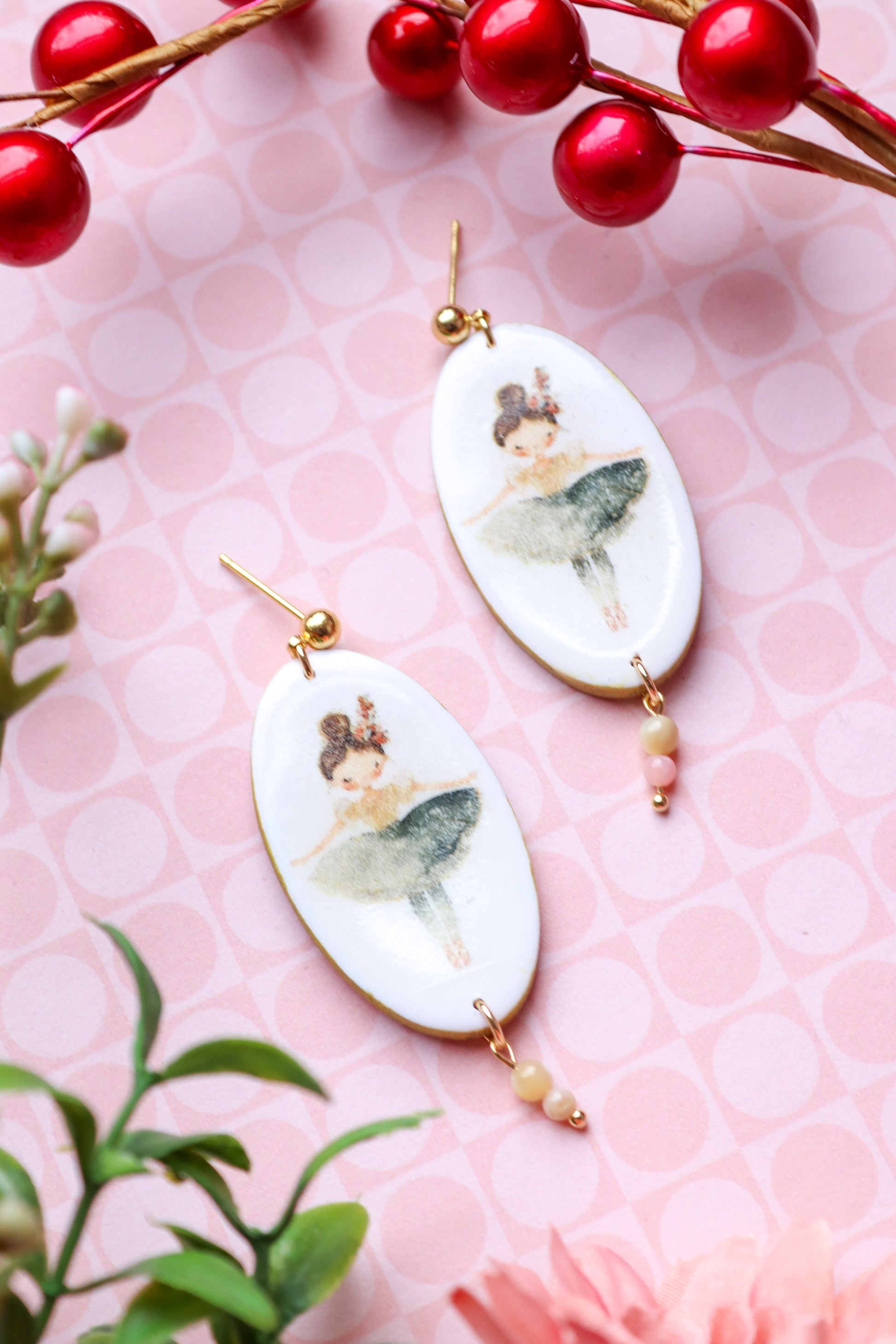 I have fond memories of going to see my cousin Haley in the local production of The Nutcracker growing up, and these beauties remind me of that experience! Gold edges and mother of pearl beads complete these quintessential holiday earrings.