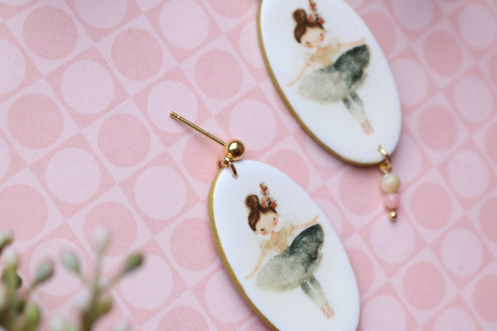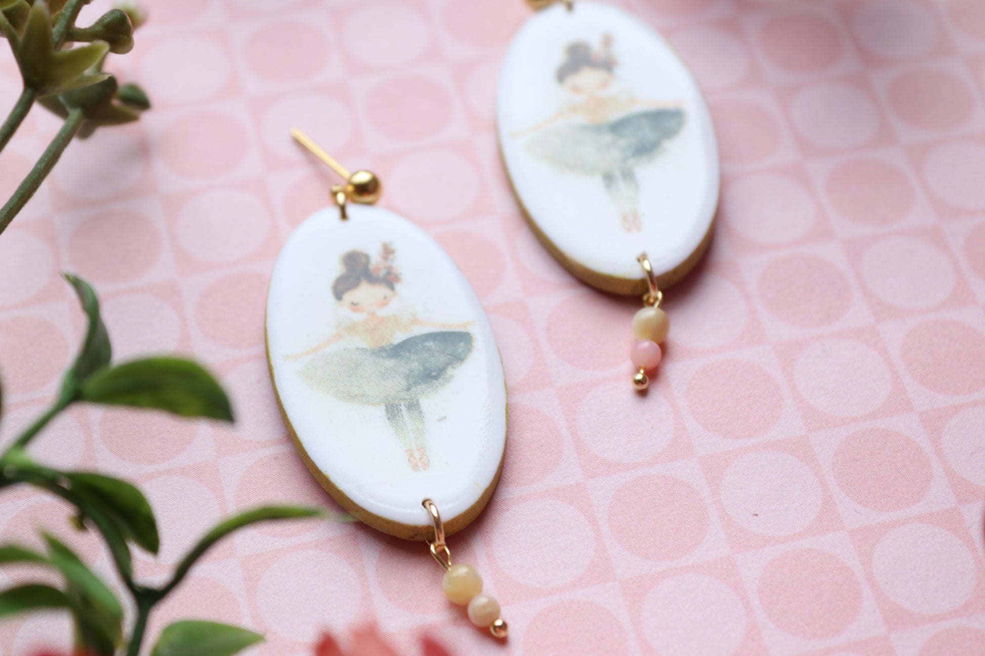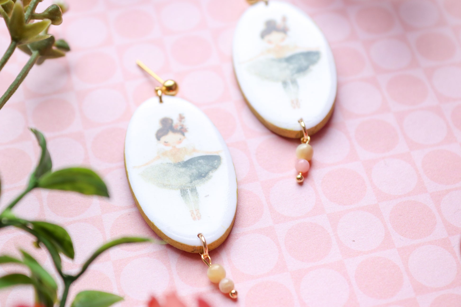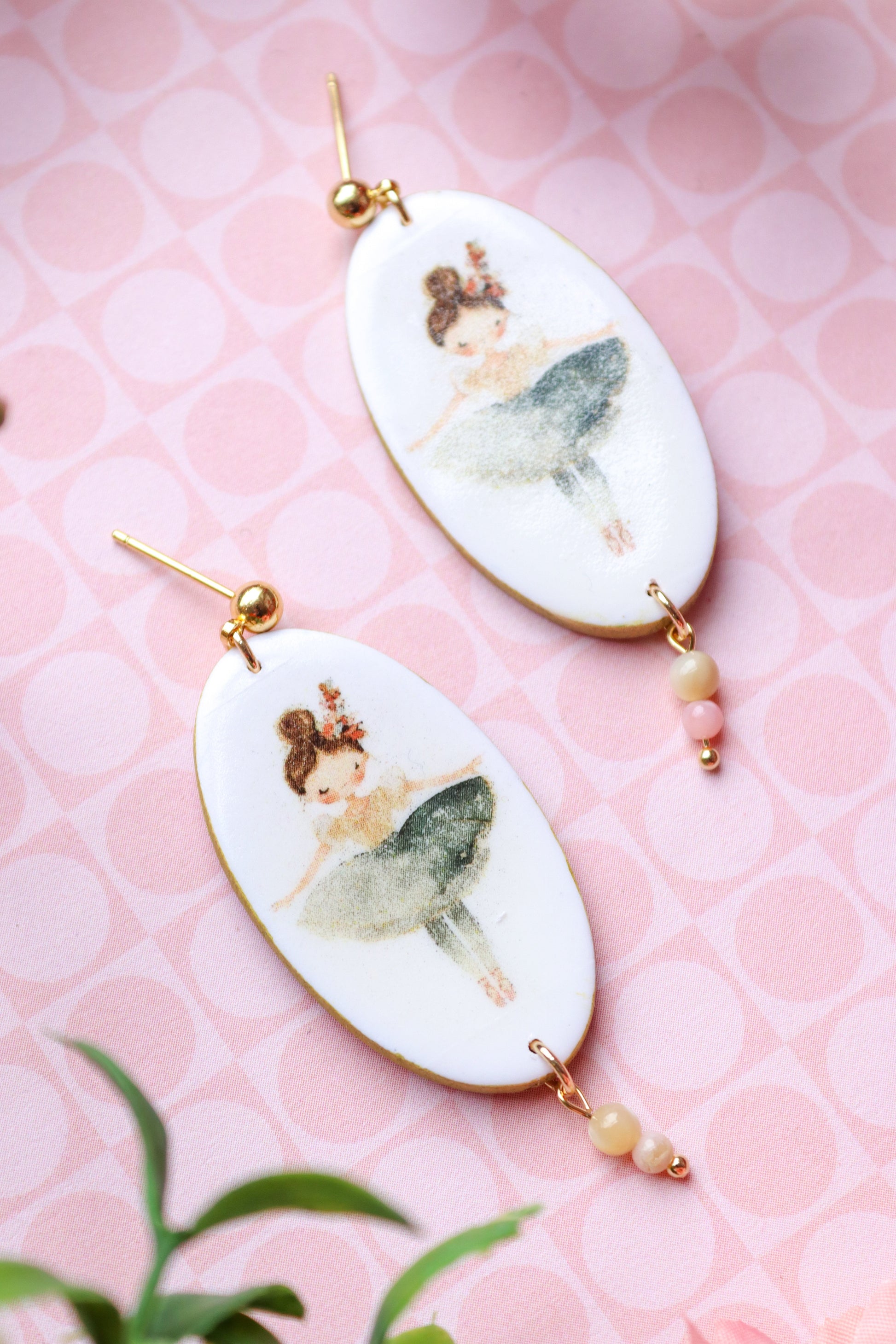 I have fond memories of going to see my cousin Haley in the local production of The Nutcracker growing up, and these beauties remind me of that experience! Gold edges and mother of pearl beads complete these quintessential holiday earrings.
